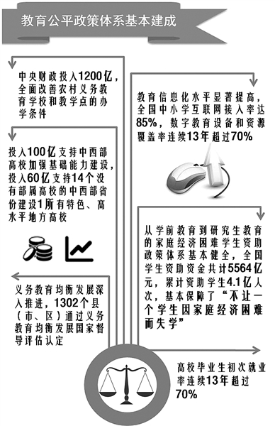 2015年的工作,为“十二五”时期教育改革发展画上了圆满句号。教育公平政策体系基本建成。中央财政投入1200亿元,全面改善农村义务教育学校和教学点的办学条件。投入100亿元支持中西部高校加强基础能力建设,投入60亿元支持14个没有部属高校的中西部省份建设1所有特色、高水平地方高校。义务教育均衡发展深入推进,1302个县(市、区)通过县域义务教育均衡发展国家督导评估认定。从学前教育到研究生教育的家庭经济困难学生资助政策体系基本健全,全国学生资助资金共计5564亿元,累计资助学生4.1亿人次,基本保障了“不让一个学生因家庭经济困难而失学”。高校毕业生初次就业率连续13年超过70%。