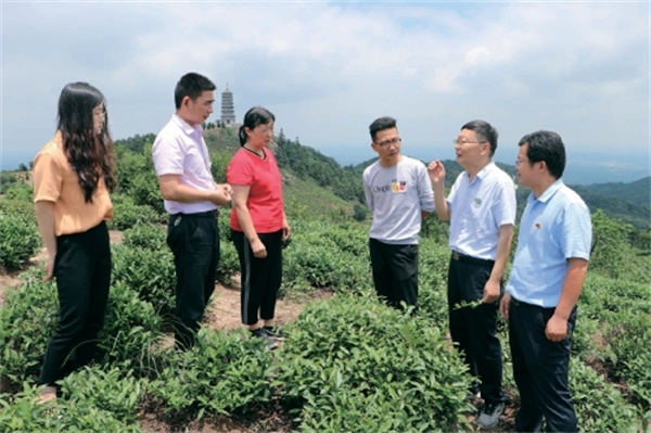 2020年6月,信阳农林学院组织茶学专家郭桂义(右二)一行赴车云山茶园为茶农开展跟踪服务。资料图